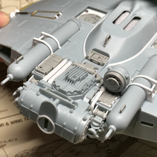 体の部分もがっつりディティールを追加します。両翼の穴の部分は排熱口という設定にして戦車キットのフィンを使用。モールドで再現されていた、ディディールは、削り取って真鍮線で再現。お尻のエンジン周辺も気になる部分に手を入れてます。下部の各バーニアは駆動にはシリンダーが必要だと考えて追加。パイピングやボルトの追加など、あんまり見えなくなっちゃうけど手を抜かずに頑張りました。